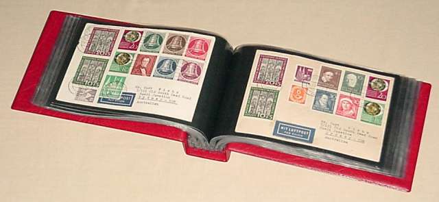 Kleines Briefalbum für 100 normale Briefezur preiswerten und sicheren Unterbringung von Briefen, Postkarten und Belegenmit 50 glasklaren Taschen (Öffnung oben) aus stabiler, weichmacherfreier Folie mit schwarzem Kartonzwischenblattfür 100 normale Briefe (DIN C6) bis ca. 190 x 125 mmin wattiertem Einband aus hochwertigem, lederartigem Kunststoff mit DruckknopfverschlußKlarsichtfenster im Albumrücken zur Bezeichnung der Albenfarblich passerde Schutzkassette verfügbar