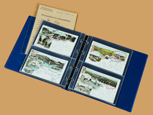 Small postcard albums with size approx. 21 x 23 cm with stock sheets for two cards per page.